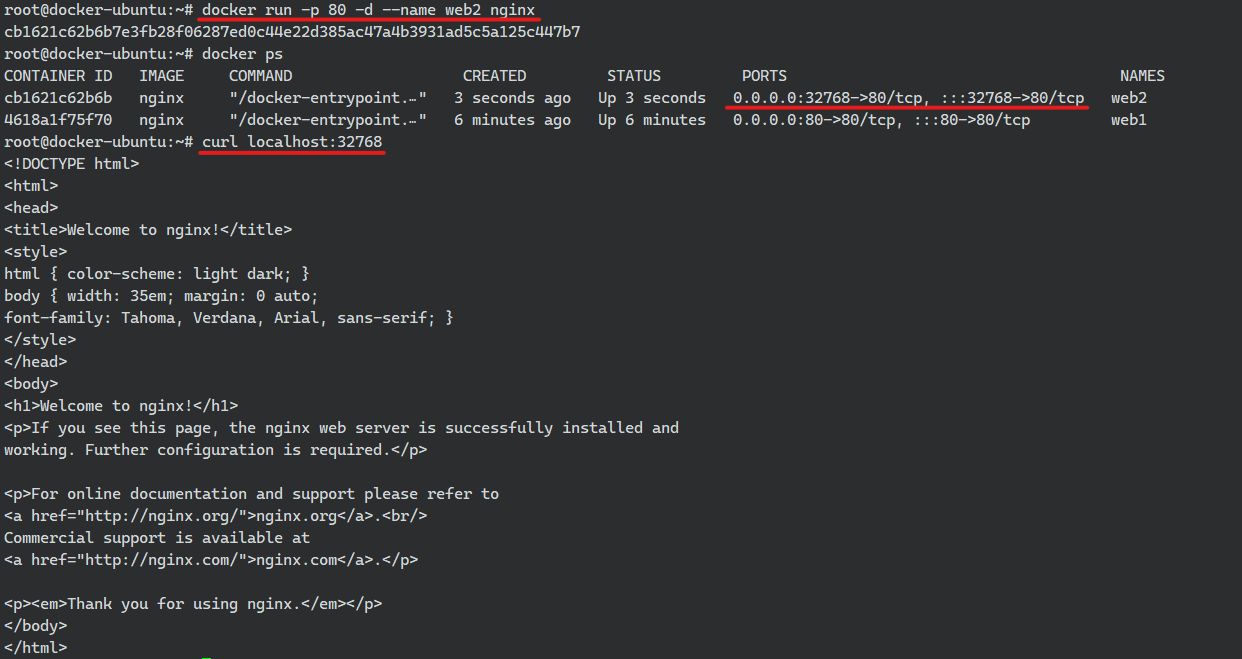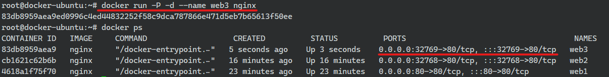 만약 대문자 P만 한다면 dockerfile에서 expose로 정의하고 있는 포트에 맞춰 랜덤 포트를 설정하게 된다.