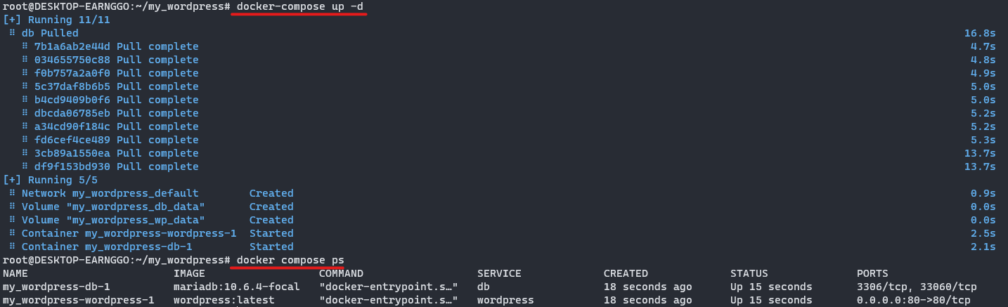 # start : 시작, up : 생성 및 실행 , d 옵션 : detach모드 즉, 백그라운드 실행