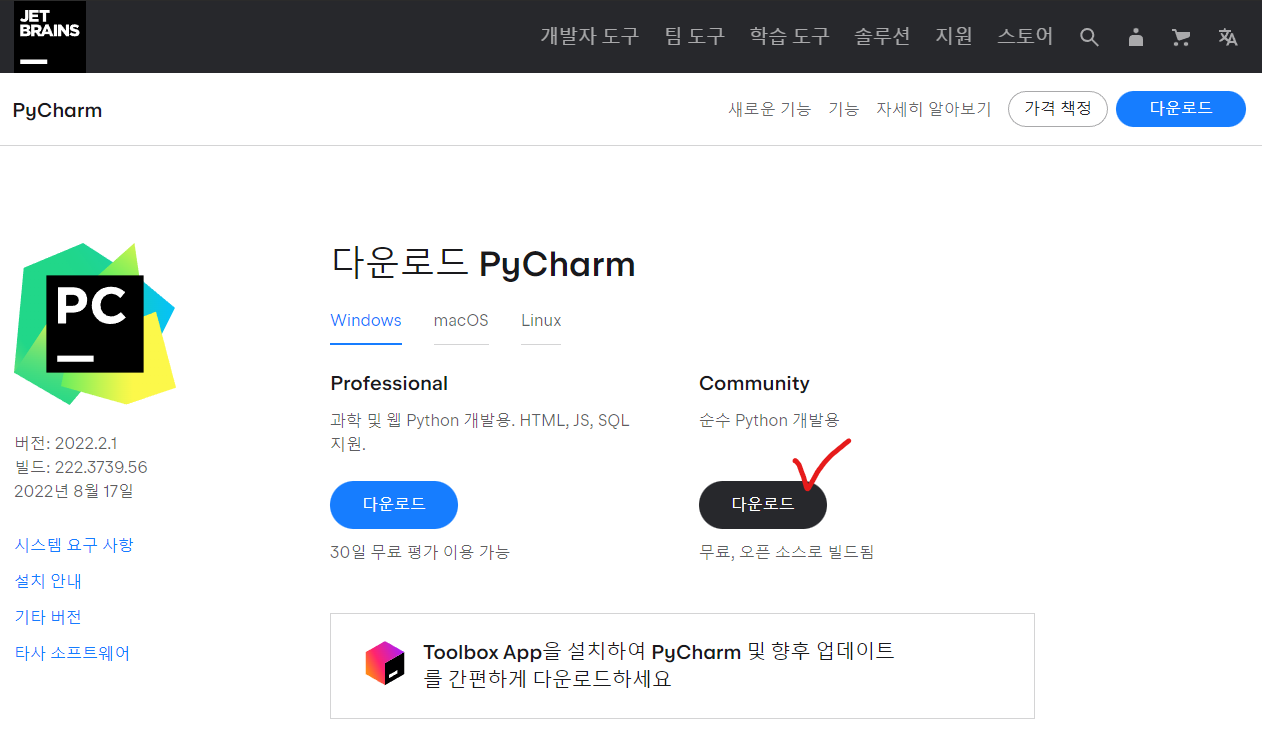 (https://www.jetbrains.com/ko-kr/pycharm/download/#section=windows)