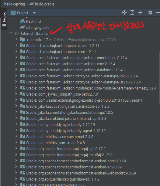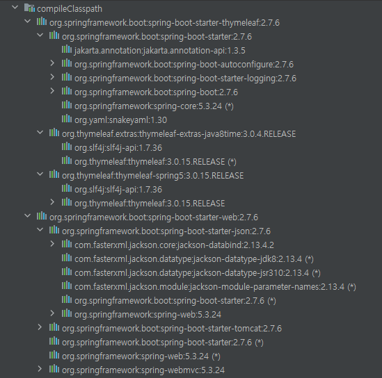 왜냐하면 우리가 Spring Web이 필요해서 이것만 끌어온다고 선택했지만 Spring Web이 또 의존하고 있는 라이브러리들을 존재한다. 결국 Spring Web을 사용하려면 이런저런 라이브러리들을 더 끌고 와야해서 실제적으로는 아래처럼 수많은 라이브러리들을 끌고 오게 되고 마지막엔 spring-core까지 끌고 오게 된다.