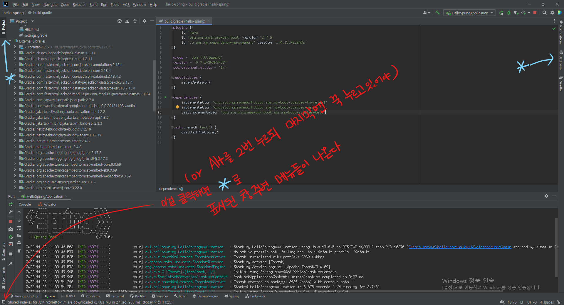 하늘 색으로 표시되는, 창을 둘러싼 메뉴들 중 오른쪽 메뉴 들 중에서 Gradle을 찾아 눌러 라이브러리를 확인할 수 있는데