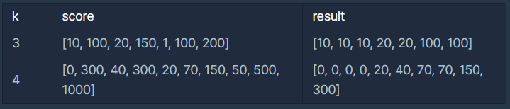 ์ด ํ๋ก๊ทธ๋จ์์๋ ๋งค์ผ "๋ช ์์ ์ ๋น"์ ์ตํ์ ์ ์๋ฅผ ๋ฐํํฉ๋๋ค. ์๋ฅผ ๋ค์ด, k = 3์ด๊ณ , 7์ผ ๋์ ์งํ๋ ๊ฐ์์ ์ ์๊ฐ [10, 100, 20, 150, 1, 100, 200]์ด๋ผ๋ฉด, ๋ช ์์ ์ ๋น์์ ๋ฐํ๋ ์ ์๋ ์๋์ ๊ทธ๋ฆผ๊ณผ ๊ฐ์ด [10, 10, 10, 20, 20, 100, 100]์ ๋๋ค.