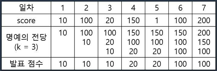 "๋ช ์์ ์ ๋น"์ด๋ผ๋ TV ํ๋ก๊ทธ๋จ์์๋ ๋งค์ผ 1๋ช ์ ๊ฐ์๊ฐ ๋ ธ๋๋ฅผ ๋ถ๋ฅด๊ณ , ์์ฒญ์๋ค์ ๋ฌธ์ ํฌํ์๋ก ๊ฐ์์๊ฒ ์ ์๋ฅผ ๋ถ์ฌํฉ๋๋ค. ๋งค์ผ ์ถ์ฐํ ๊ฐ์์ ์ ์๊ฐ ์ง๊ธ๊น์ง ์ถ์ฐ ๊ฐ์๋ค์ ์ ์ ์ค ์์ k๋ฒ์งธ ์ด๋ด์ด๋ฉด ํด๋น ๊ฐ์์ ์ ์๋ฅผ ๋ช ์์ ์ ๋น์ด๋ผ๋ ๋ชฉ๋ก์ ์ฌ๋ ค ๊ธฐ๋ ํฉ๋๋ค. ์ฆ ํ๋ก๊ทธ๋จ ์์ ์ดํ ์ด๊ธฐ์ k์ผ๊น์ง๋ ๋ชจ๋ ์ถ์ฐ ๊ฐ์์ ์ ์๊ฐ ๋ช ์์ ์ ๋น์ ์ค๋ฅด๊ฒ ๋ฉ๋๋ค. k์ผ ๋ค์๋ถํฐ๋ ์ถ์ฐ ๊ฐ์์ ์ ์๊ฐ ๊ธฐ์กด์ ๋ช ์์ ์ ๋น ๋ชฉ๋ก์ k๋ฒ์งธ ์์์ ๊ฐ์ ์ ์๋ณด๋ค ๋ ๋์ผ๋ฉด, ์ถ์ฐ ๊ฐ์์ ์ ์๊ฐ ๋ช ์์ ์ ๋น์ ์ค๋ฅด๊ฒ ๋๊ณ ๊ธฐ์กด์ k๋ฒ์งธ ์์์ ์ ์๋ ๋ช ์์ ์ ๋น์์ ๋ด๋ ค์ค๊ฒ ๋ฉ๋๋ค.