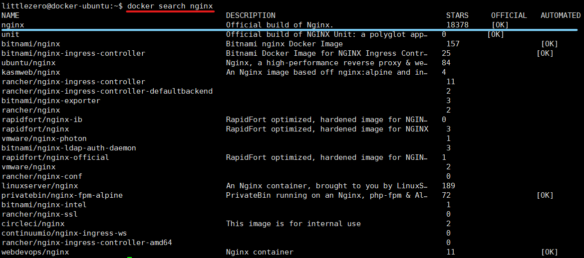 - $ docker search nginx > dockerdμκ² μμ² > Dockerhubμμ κ²μ > μ΄λ―Έμ§ κ²μ μ±κ³΅