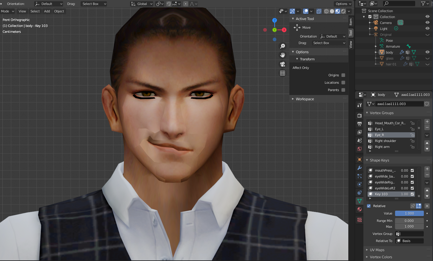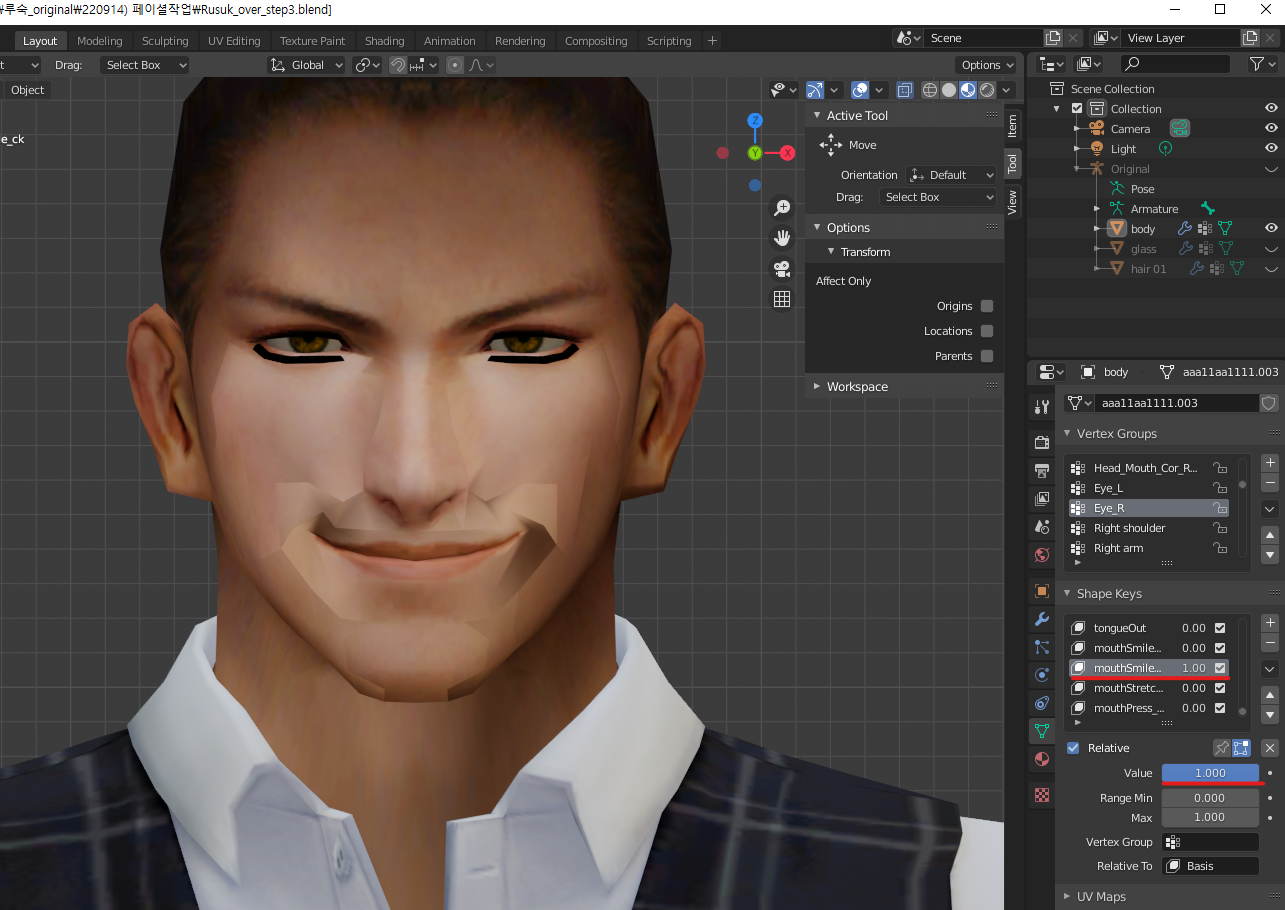 수치를 늘려보면 이전 얼굴형태와 동일한 쉐이프키가 복제된걸 확인할 수 있다.