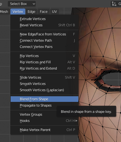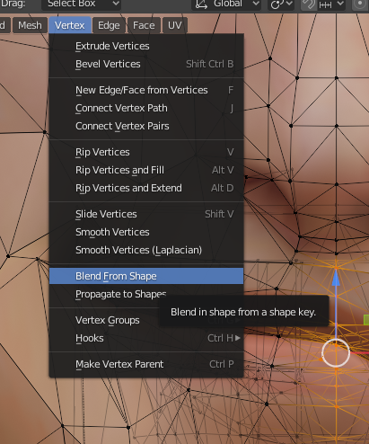5. 그상태로 Edit mode 메뉴에서 Vertex > Blend From Shape 키를 누른다