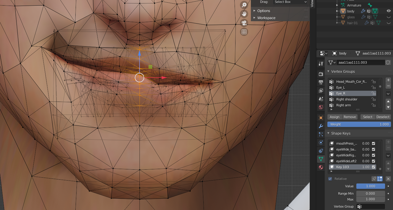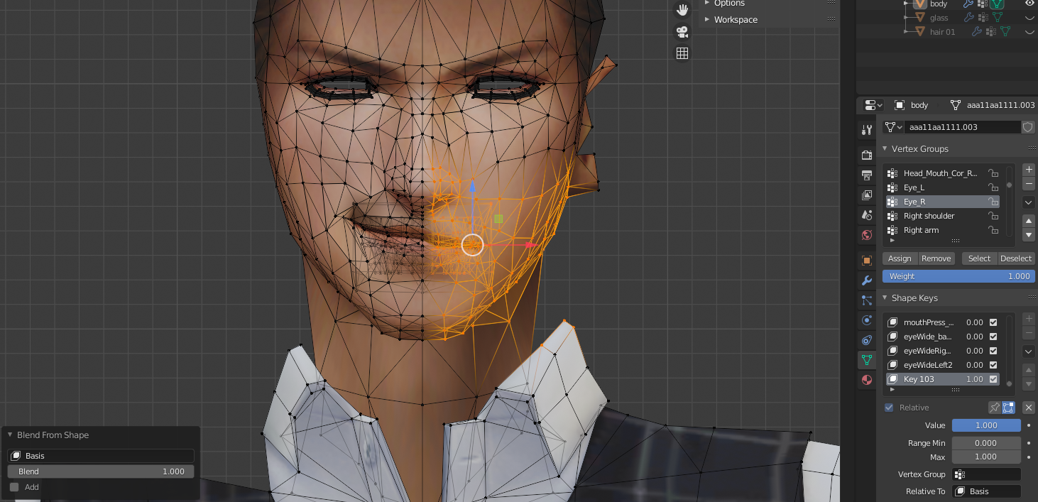 Edit모드에 들어가서 Basis 즉, 기본표정으로 돌릴 부분의 버텍스를 선택한다. (중앙선 부분은 나중에 다른수치로 처리)