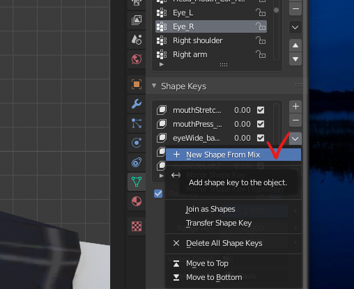 2. 불필요한 쉐이프키가 들어갔는지 확인하고 ∨의 New Shape From Mix를 눌러 현재상태를 그대로 복사한 쉐이프키를 복제한다.