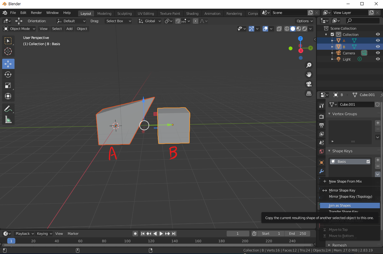 10. 똑같이 Edit mode > Vertex > Blend From Shape