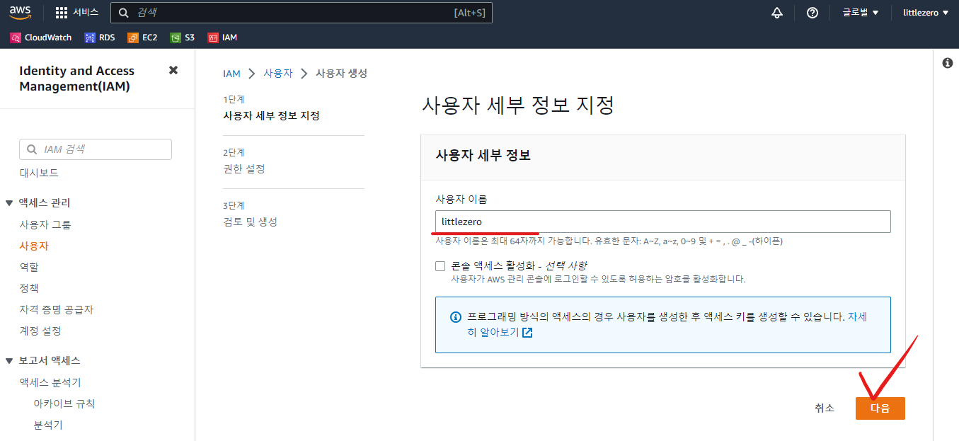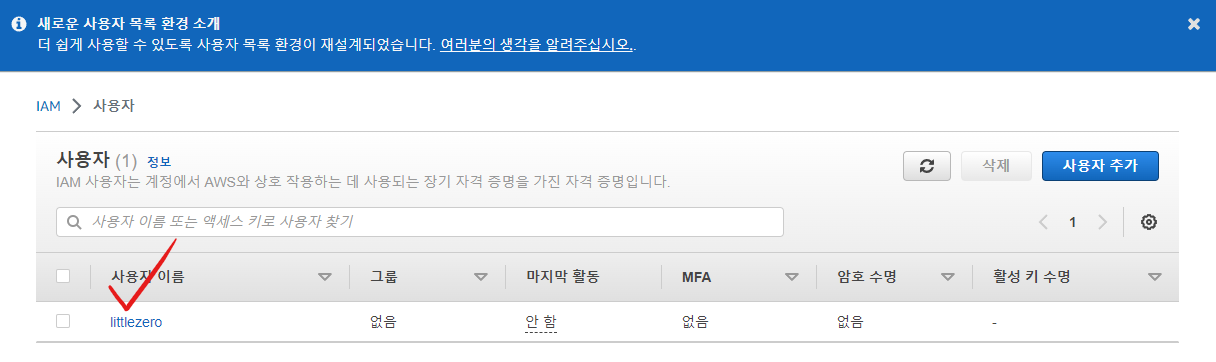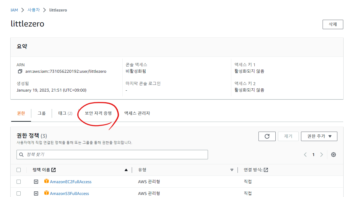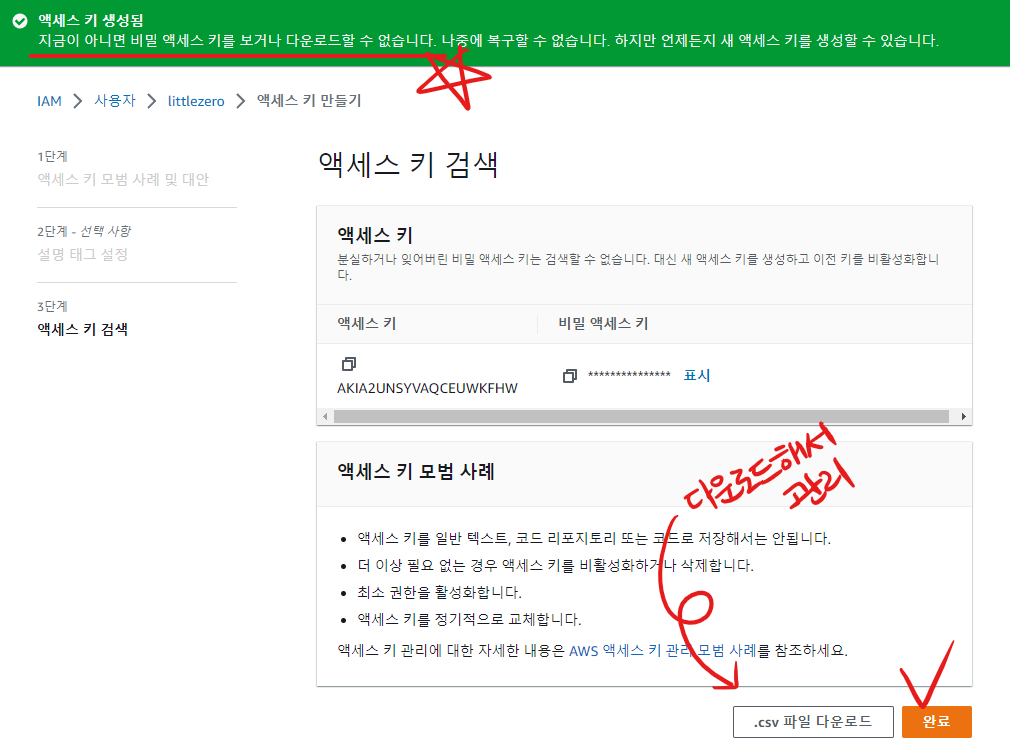 ************* 액세스 키는 생성하면 그 순간에만 볼 수 있고 다운받을 수 있다. 다운받아 잘 보관해두자.