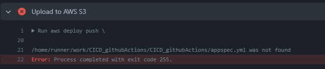 문제: github actions에서 Deploy가 성공했음에도 불구하고 실제로 AWS Deploy결과를 봤을 때 ApplicationStop에서 바로 실패한 케이스