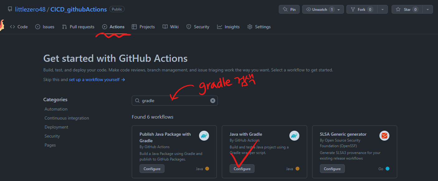 깃헙에서 Actions > gradle 검색 > java with Gradle 의 Cofigure 클릭