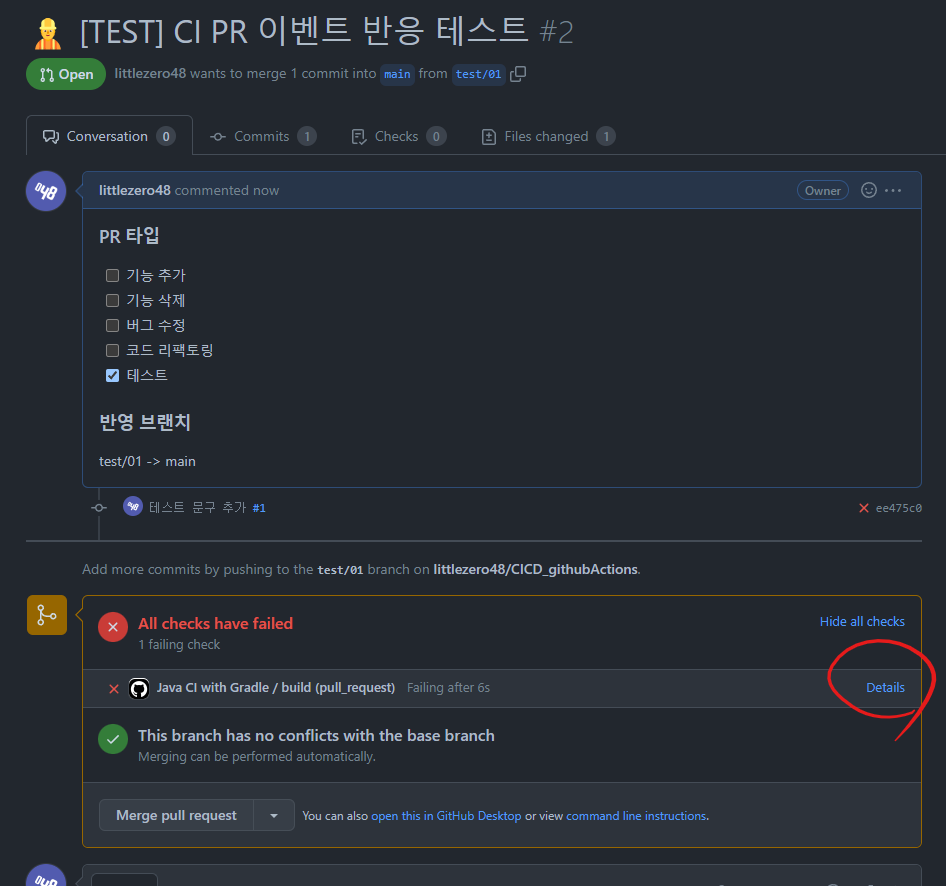 브랜치를 하나 새로 만들어 워크플로우 이벤트에 반응하게 main에 PR을 해봤다 그런데 앗, 트러블 발생!