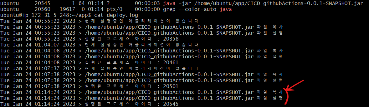 이 로그를 보면 현재 실행중인 애플리케이션이 없다고 한다. 하지만 아래처럼 쉘 스크립트를 넣어줬고, 기존 nohup을 죽이고 새로운 빌드 파일로도 변경이되서 nohup으로 돌아가는 상황. 근데 프로세스가 켜져있어서 stop.sh가 kill해줬다면 실행중인 프로세스 아이디와 애플리케이션 종료에 대한 로그도 찍혔어야하는 데 없다. 이미 stop전에 프로세스가 kill이 된 것으로 보인다.