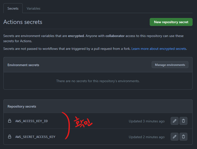 📍 둘다 AWS환경 설정 글에서 9번에서 만든 것을 yml에 넣어줘야 한다.