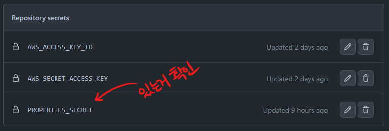 이 형식을 그대로 사용하기 위해서 기본 application.properties는 깃헙에 올라가게 두고, application-secret.properties는 .gitignore에 추가해 깃헙에 올라가지 않게 설정했다. 그리고 github의 secrets에는 application-secret의 내용을 넣을 예정