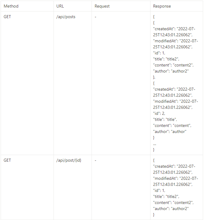 | 기능 | Method | URL | Request | Response |